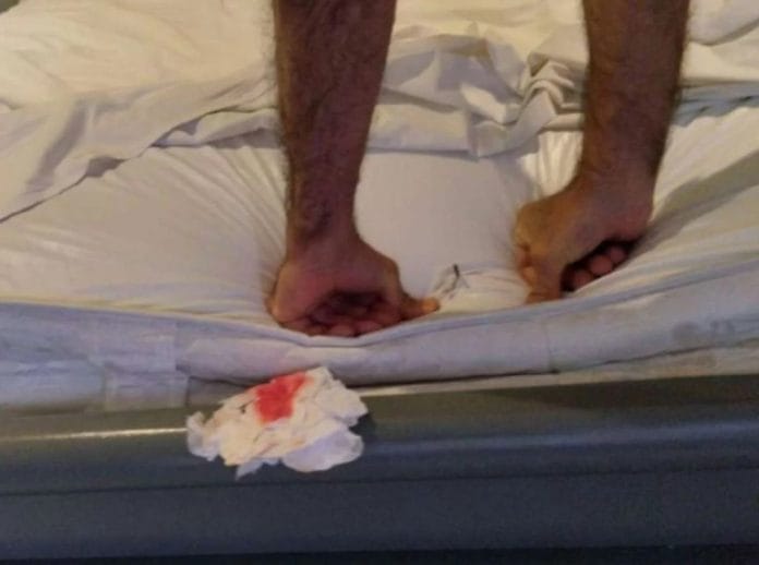 Ao processo, seus advogados anexaram fotos nas quais o homem pressionava as mãos no colchão para mostrar o ponto onde estava o prego. As imagens também mostram pingos de sangue no chão do quarto e o furo no joelho do hóspede.