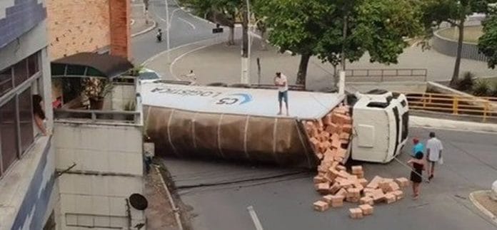 Um caminhão tombou na manhã desta segunda-feira (19) no contorno da ‘rotatória do INSS’, no bairro Catolé, em Campina Grande. O veículo transportava uma carga de alimentos.