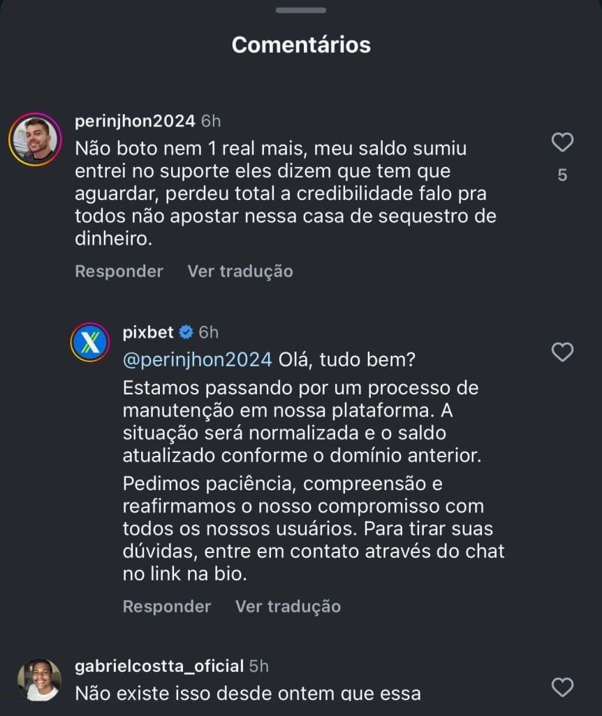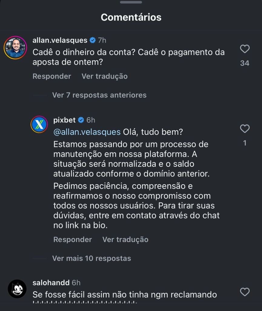 Em resposta aos usuários, a PixBet pediu paciência e informou que está “passando por um processo de manutenção”. A empresa garante que tudo será normalizado.
