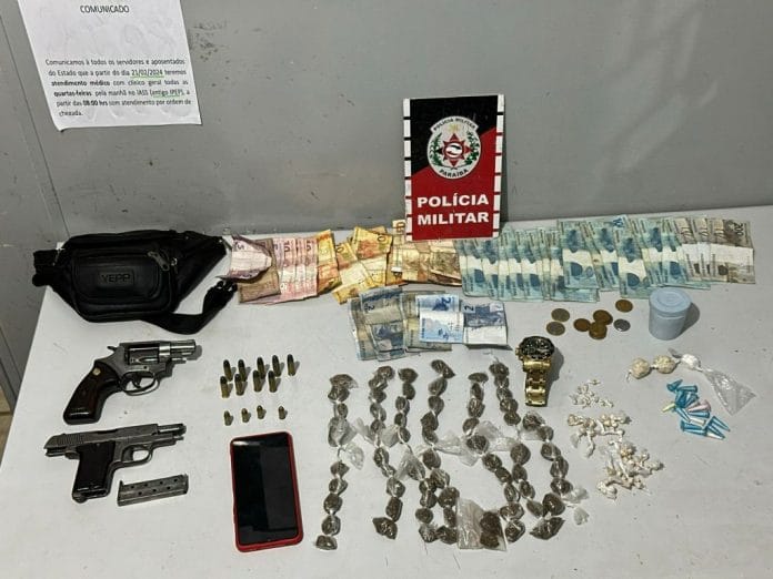 Com o preso, foi apreendido um revólver e uma pochete com drogas e dinheiro trocado.