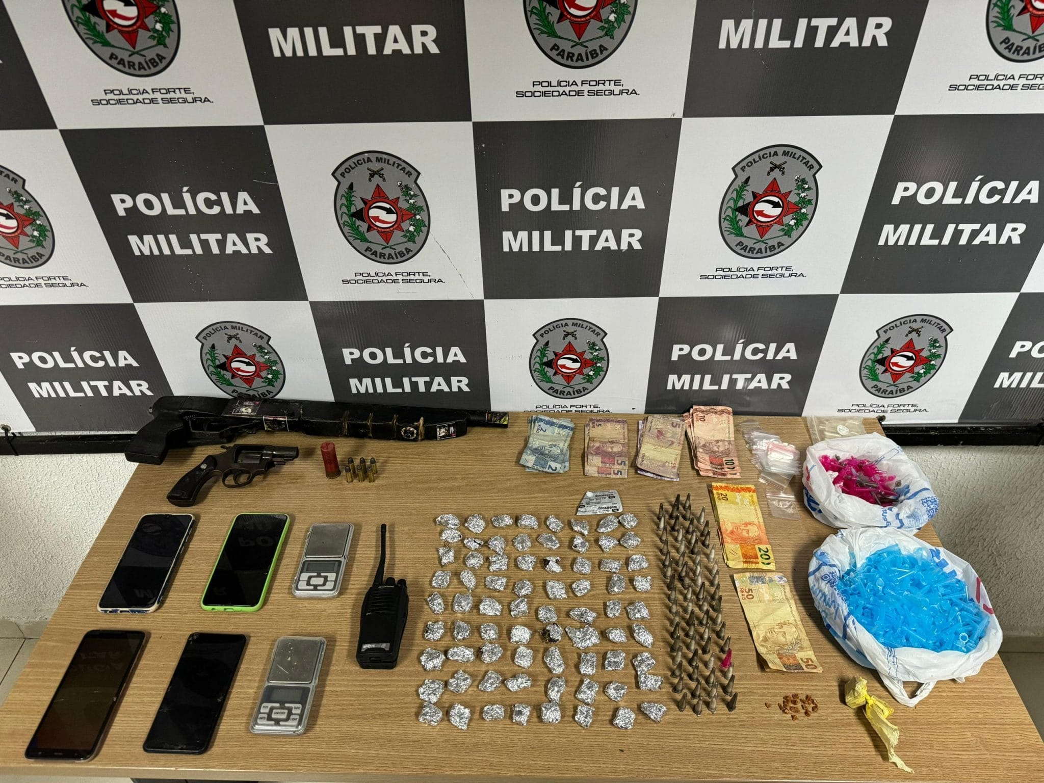 Com eles, foram apreendidos um revólver, uma espingarda, um rádio comunicador, balanças de precisão, dinheiro e drogas dos tipos cocaína, crack e maconha.