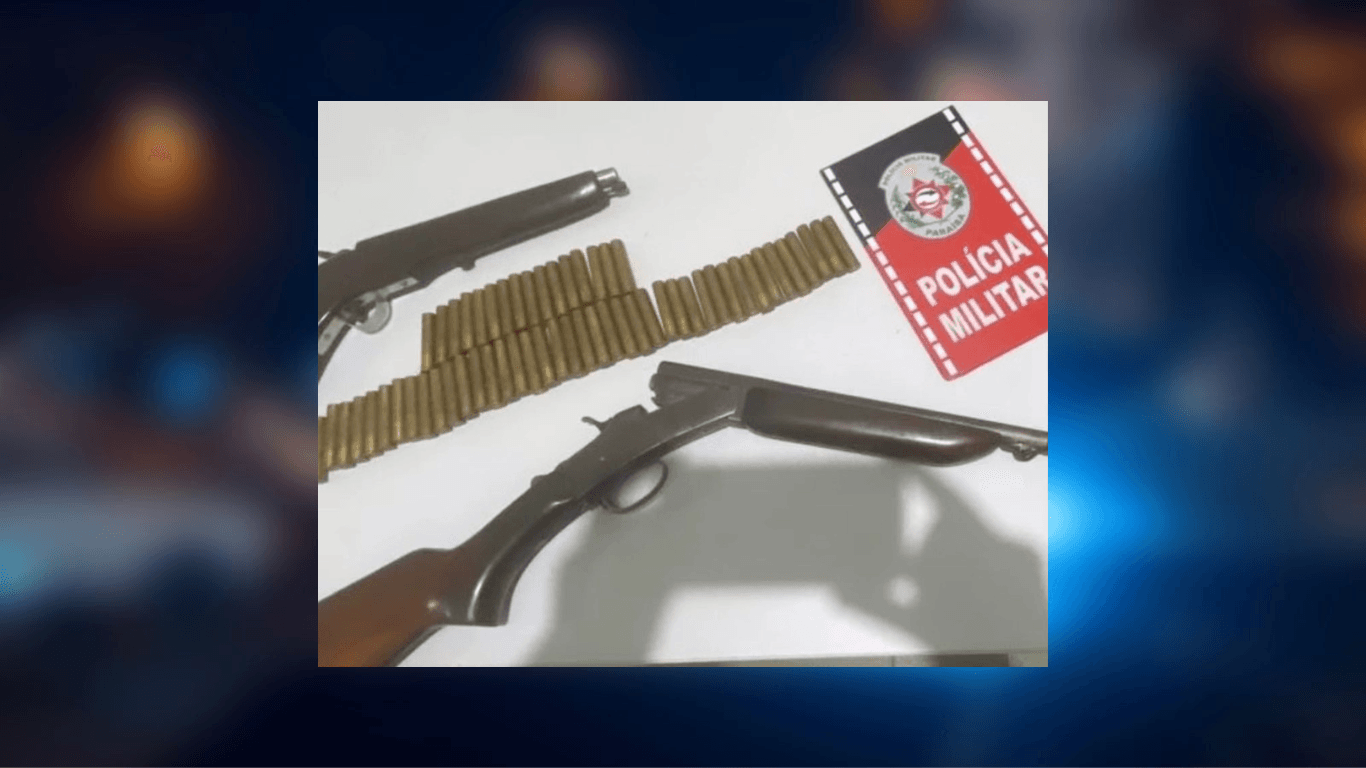A guarnição da Força Tática se deslocou para o local indicado, onde a vítima informou estar sendo ameaçada pelo seu esposo. Após adentrarem na residência, os policiais encontraram o suspeito bastante alterado, o qual confirmou possuir duas armas de fogo sem registro: uma espingarda calibre 36, marca Rossi, com 57 munições intactas, e uma espingarda calibre indefinido de fabricação artesanal.