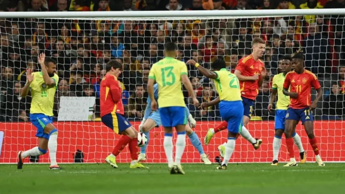 A Seleção Brasileira empatou com a Espanha nesta terça-feira (26) com o placar de 3 a 3, em amistoso no estádio Santiago Bernabéu, em Madri, na Espanha. Em duas cobranças de pênaltis polêmicas, Rodri marcou duas vezes e Dani Olmo fizeram os gols dos espanhóis. Rodrygo, Endrick e Lucas Paquetá, nos acréscimos do segundo tempo, anotaram para os brasileiros.