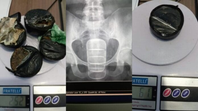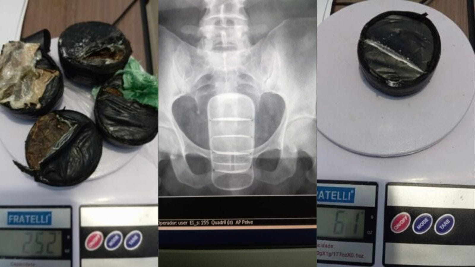 O material, que estava escondido em papelotes, foi encontrado através de uma revista corporal com o uso de um detector. Ao todo, a polícia encontrou 250 gramas de maconha e 60 gramas de cocaína.