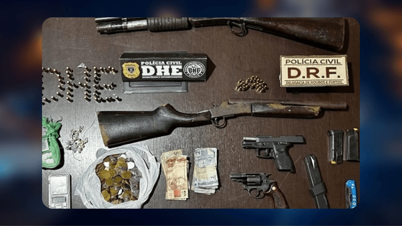Na residência foram encontradas três armas de fogo, sendo uma espingarda calibre 12 de repetição, um revólver calibre 38 e uma pistola 9mm com um carregador alongado. Uma quarta espingarda calibre 12 foi encontrada com o indivíduo que empreendeu fuga. Por fim, uma quinta arma de fogo, sendo um revólver calibre 38, foi encontrada nas buscas no imóvel.
