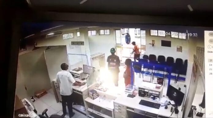As imagens mostram que uma dupla chega à agência, rende o funcionário e um cliente. Eles tomaram dinheiro e celulares ameaçando o funcionário com uma arma.