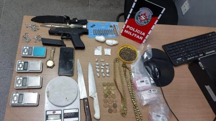 “Apreenderam aparentemente porções de cocaína, papelotes de maconha, sementes de cannabis, 05 (cinco) balanças de precisão, pequena quantia em dinheiro, simulacro de pistola, além de 10 (dez) munições Cal .32, 01 (um) relógio, adornos, facas e invólucros normalmente utilizados para embalagens de entorpecentes”, diz nota do 2º Batalhão de Polícia Militar.