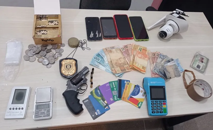 Segundo a Polícia Militar, na casa do suspeito foram encontrados um revólver, munições, balanças de precisão, dinheiro, uma maquineta de cartão de crédito e vários cartões do programa Bolsa Família.