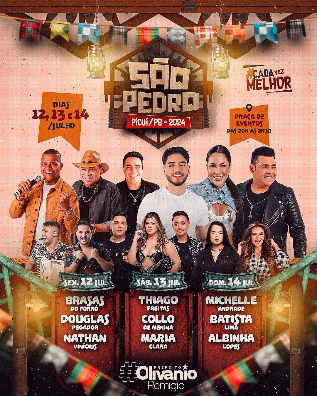 O São Pedro de Picuí começa na sexta-feira (12) e vai até o domingo (14) com uma vasta programação. A abertura ficará por conta das bandas Brasas do Forró, Douglas Pegador e Nathan e Vinícius. No sábado (13), sobem ao palco Thiago Freitas, Collo de Menina e Maria Clara. Já no domingo, para encerrar o evento, a festa fica por conta de Michelle Andrade, Batista Lima e Albinha Lopes.