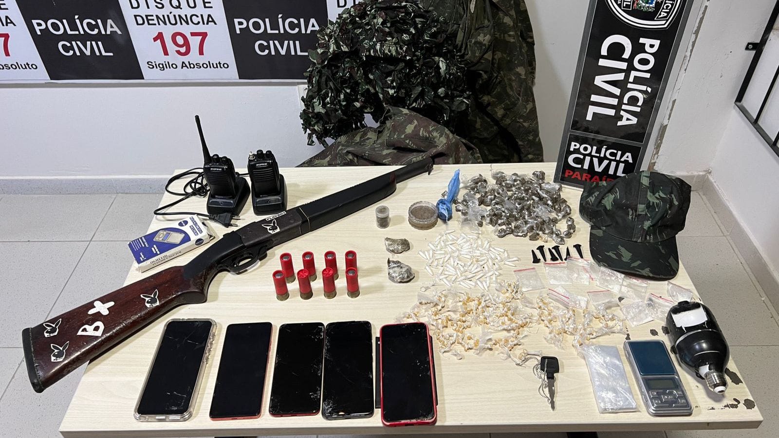 Segundo a polícia, todo o material estava em um imóvel usado para comércio e armazenamento de armas e drogas. No local, foram apreendidos maconha, cocaína, crack, uma espingarda calibre 12, balança de precisão, celulares, câmeras de monitoramento, rádios comunicadores e roupas camufladas.