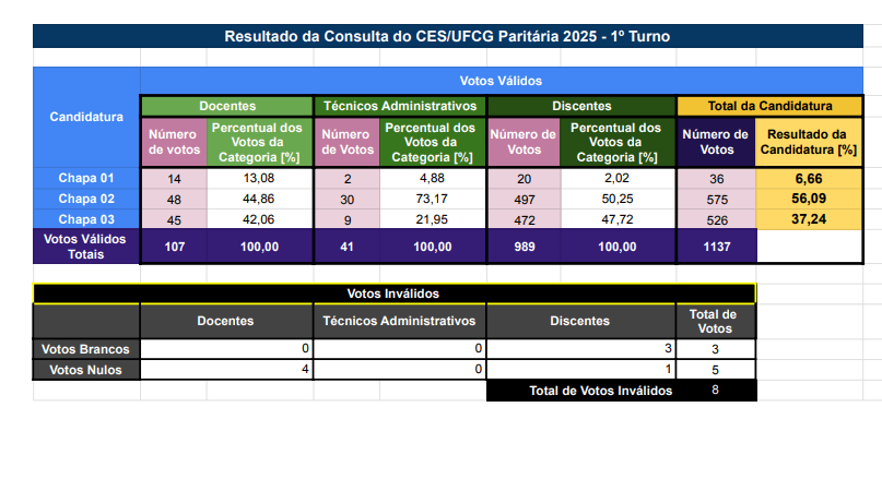 A Comissão da Consulta Democrática (CCD – CES) publicou na noite desta terça-feira, dia 18, o resultado da apuração da votação para a escolha da Direção do Centro de Educação e Saúde (CES), para o quadriênio 2025-2028.
