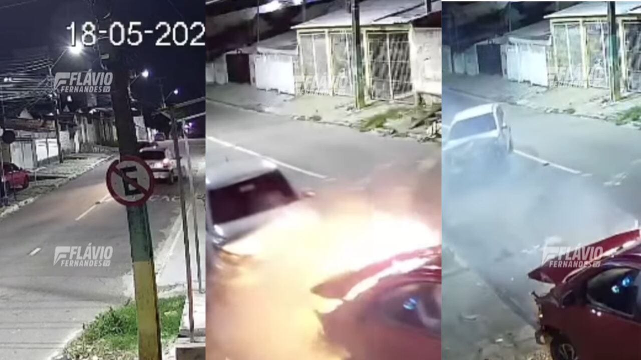Um carro pegou fogo após bater em outros veículos na noite deste domingo (18), na Avenida Centenário, em Cruz das Armas, em João Pessoa.