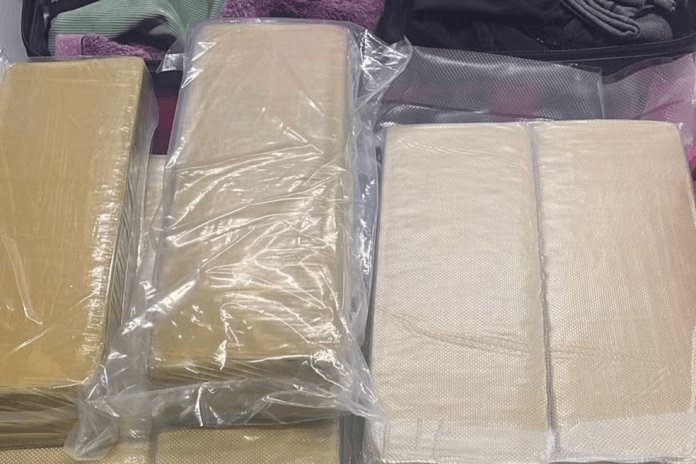 Os policiais federais encontraram aproximadamente 10,20 kg de maconha, divididos em tabletes e embalados a vácuo, escondidos na bagagem.
