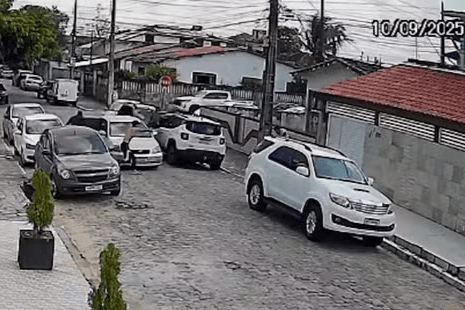 Câmeras de segurança na rua em que o crime aconteceu mostram que os suspeitos saíram de um carro prata e atiraram contra o homem que estava em uma calçada.