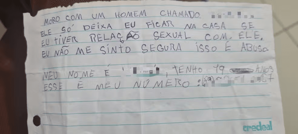 Outro delegado que acompanhou o caso, Danilo Orengo, informou que a carta entregue pela vítima pedindo socorro das condições de abuso foi entregue após ela pedir ao suspeito para ir a uma consulta no dentista. Na ocasião, ele autorizou. Ela aproveitou essa oportunidade de sair de casa para entregar a mensagem para funcionários do Centro de Referência de Assistência Social (Cras), que acionaram a polícia.